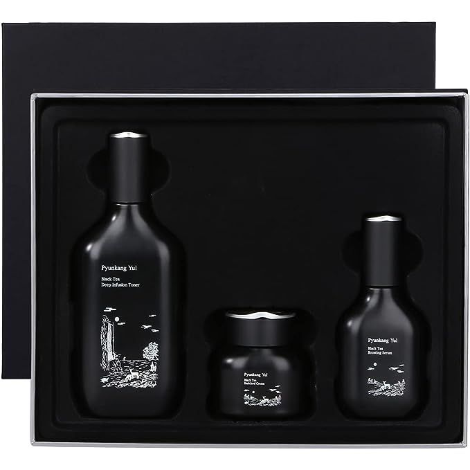 🖤 WHY PYUNKANG YUL? - Along with know-how recipe of Pyunkang Yul Eastern Medicine Clinic, specialized in treating skin and respiratory diseases for about 50 years, the luxurious eluding age and beauty black tea line gift set helps to maintain youthful glow and boost firming energy by carefully selected ingredients found in nature and rigorous testing.🖤 IMPROVE SKIN ELASTICITY BY KOMBUCHA ENERGY - Luxury skincare collection with the key ingredient of (Fermented Black Tea) Kombucha is fermented from 7 days to 30 days or more containing rich ingredients such as Polyphenol, catechin. The gift box set is aged focused and delivers the power of condensed fermentation to keep the skin plump.🖤 MOISTURE CONTENT UP WITH GINSENG ROOT- Rich in Saponins and Polyphenols reinforces the skin barrier, nourishes dry skin and reduce sebum resulting from aging skin therefore its natural strength should be developed. Ginseng Berry extract which contains the core nutrients of Ginseng, delivers deep and intensive nourishment so that makes taut and bouncy skin.🖤 SECRET OF BRIGHT RADIANT SKIN - Naturally-sourced Seaberry exctracts deliver strong vitality deep inside of skin enchancing the luminous skin that glows from all angles. Niacinamide substances reduce the appearance of dark spots therefore makes translucent and even skin tone. The moisturizing formula deeply absorbed into the skin, making tired skin stronger all day long.