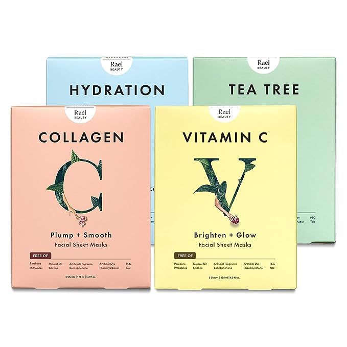 Rael Face Mask Skin Care, Bamboo Facial Mask Sheet Set - Variety Pack, All Skin Types, Gift Set (5 Hydration, 5 Vitamin C, 5 Collagen, 5 Tea Tree, 20 Sheets)