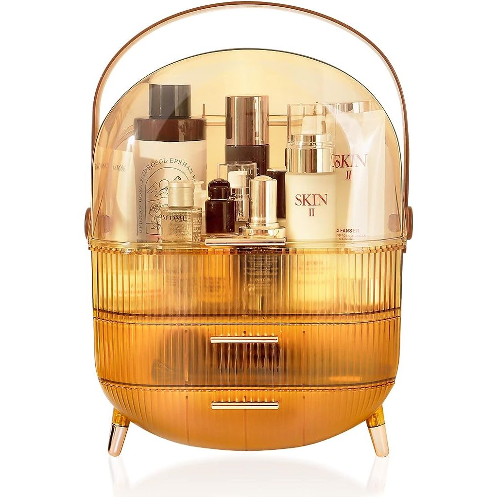 MASSY Egg Shape(Oval) Makeup Storage Box, Countertop Portable Vanity Cosmetics Organizer Preppy Style (MBOX-01-Amber)