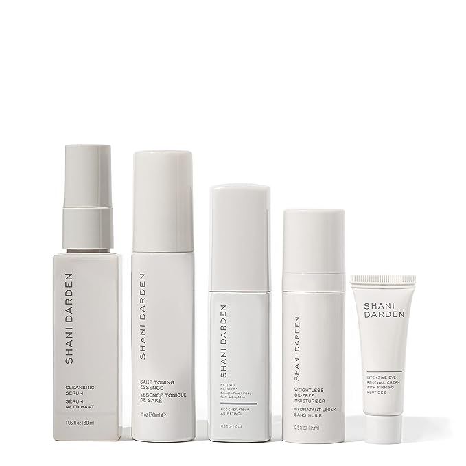 Shani Darden Discovery Kit. This travel-sized set of 5 powerful anti-agers effectively blurs the look of fine lines and wrinkles, boosts skin elasticity, and promotes a more youthful complexion.Cleanse + Smooth. The Retinol Reform smooths skin texture and fights wrinkles while the Cleansing Serum melts away impurities without stripping. The Sake Toning Essence mattifies and refines pores.Hydrate + Restore. The Weightless Oil-Free Moisturizer plumps and hydrates skin for restored suppleness while the Intensive Eye Renewal Cream gently lifts and fades the appearance of lines and evens out circles.How To Use It. Massage the Cleansing Serum into face then rinse with warm water. Next, apply the Sake Toning Essence to face and neck. Gently tap the Eye Renewal Cream into the under-eye area. Finish by smoothing 2-4 pumps of the Moisturizer onto face.Results-Oriented Skin Care. Expert esthetician Shani Darden shares her proven formulas for all skin types. Products are cruelty-free, vegan, and free from parabens, silicone, and fragrance.