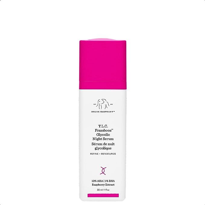 T. L. C. FRAMBOOS GLYCOLIC NIGHT SERUM. A 12% AHA/BHA night serum that helps refine and resurface skin to reveal a smoother and more radiant looking complexion. It enhances the performance of other products by clearing the way for maximum absorption.WHAT IT IS FORMULATED TO DO. This high-tech gel resurfaces dull skin and gently lifts dead skin cells away for a clear, smooth, and even looking complexion. It delivers precise chemical exfoliation without harsh side effects like dryness or sensitization.NO QUESTION IN QUALITY. A routine is only as good as its worst product, and a product is only as good as its worst ingredient. Drunk Elephant is dedicated to your internal health and external skin health; "If there's any DOUBT, it's OUT."SENSITIVE VS. SENSITIZED. When skin is exposed to irritants and sensitizers, damage can be imperceptible and cumulative, leaving it in a reactive mode. "Sensitive" skin is often just skin that has become sensitized over time by harsh additives.MADE IN THE USA. Drunk Elephant doesnt take shortcuts or compromise ingredients to save money. They are hands-on and will stay true to their ethos. Their products are designed, tested and made in the United States. Drunk Elephant is certified cruelty-free, they have never, nor will ever, animal test or allow products to be tested on animals.